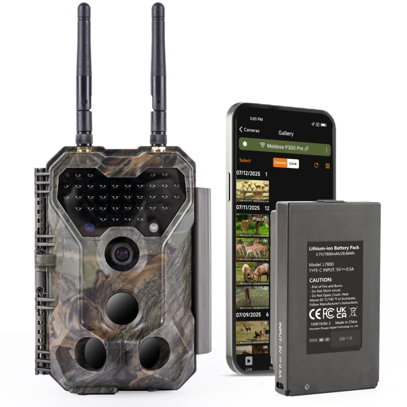 50m Transmission without Network! Meidase P300 Pro WiFi Trail Camera Learn More Meidase S965 Pro 4G LTE Cellular Trail Camera 7800mAh Lithium Battery Included Meidase S970 Pro 4G LTE Cellular Trail Camera 7800mAh Lithium Battery Included, camouflage Meidase P300 Pro Trail Camera , WiFi Bluetooth, Rechargeable